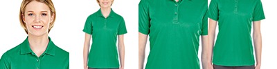 4.4 oz., 100% polyester mesh piqué; Moisture-wicking; Pill-resistant; UV protection; Feminine fit; Fully taped flat rib-knit collar; Half-moon patch; 3-button placket with dyed-to-match buttons;