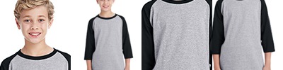 5.3 oz./yd²; 100% cotton ; Contrast color set-in collar and 3/4 raglan sleeves; Single needle topstitched back neck; Double needle sleeve and bottom hems; Tear away label; Quarter-turned to eliminate center crease; Cpsia tracking label compliant;
