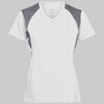 100% polyester wicking smooth knit * Wicks Moisture * Odor resistant * Ladies' fit * Tag-free label * V-neck collar * Contrast color collar and princess seams * Set-in cap sleeves